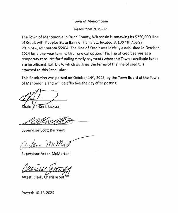 Thursday October 23, 2025, at 7pm Town of Plan Commission Meeting at the Town Hall located at E4055 550th Ave Menomonie.